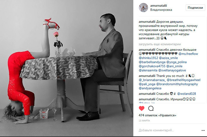 В профиле в основном йога, личной жизни мало, но все же есть. Раньше думала завести личный аккаунт, но так этого и не сделала, и все мои личные знакомые смирились с моей йоганутостью. И тем не менее в Instagram я открыта для новых знакомств. Если спрашивают моего совета, обязательно отвечу. Спрашивайте!