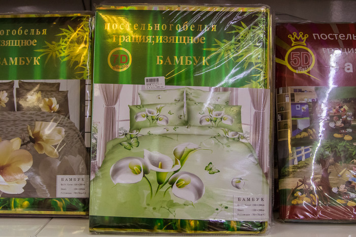 Самый дешевый комплект постельного белья стоит 650 рублей. Хлопок, бязь, шелк – все, что душе покупателя угодно. Комплекты есть полутораспальные, двухспальные, с обычными наволочками, а также для узких подушек.