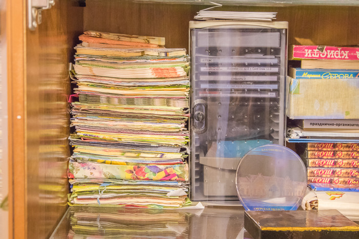 В этом шкафу есть место и для материалов для рукоделия. Например, хранятся салфетки для декупажа. Причём самых разнообразных расцветок.