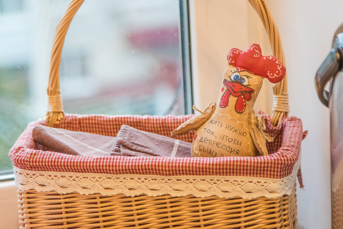 Украшает полку и музыкальная пластинка, сделанная под старину. Под ней стоит плетёная корзина из лозы. Этот предмет интерьера ручной работы хозяйка привезла из Крыма и посадила в неё тряпичную курицу.