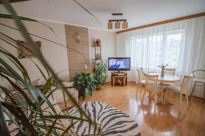 Из светлой прихожей мы проходим в не менее светлый зал. «Сердце квартиры» плавно переходит в столовую, а затем и в кухню. Всё дело в том, что на своих 70-ти квадратах владельцы квартиры пару лет назад сделали перепланировку. Светлые обои на стенах и белая мебель – вот, что бросается в глаза в этой комнате.