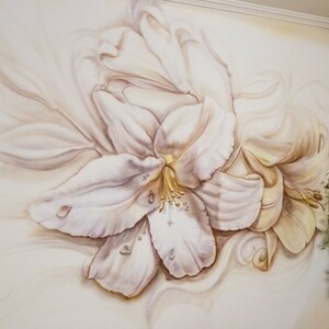 Первое время делали аэрографию на автомобилях, мотоциклах и запасках. Потом в ход пошли мобильные телефоны и ноутбуки. Затем поступили предложения от дизайнеров интерьеров и строительных бригад: разрисовывать стены и потолки в детских комнатах, торгово-развлекательных центрах, парикмахерских и кафе. Сейчас заказывают аэрографию на одежде, мебельных фасадах, на наливных полах. Кстати, у себя дома мы тоже сделали аэрографию на полу и стенах. Цветок на стене нарисован 12 лет назад. Сверху ничем рисунок не покрывали, и, тем не менее, он не выцвел до сих пор! Вообще, аэрография почти вечна.