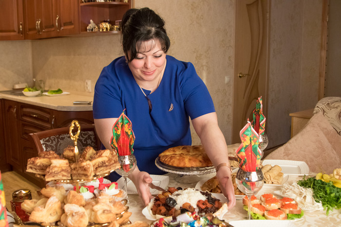Многие блюда на столе – овощные и украшены зеленью. Дело в том, что перед Рождеством некоторые армяне постятся, и, чтобы им было легче выйти из поста, они едят много овощей. В этот христианский праздник у нас на столе сразу два главных блюда: рыба и плов. Они как бы объединяют за одним столом русские и армянские традиции.