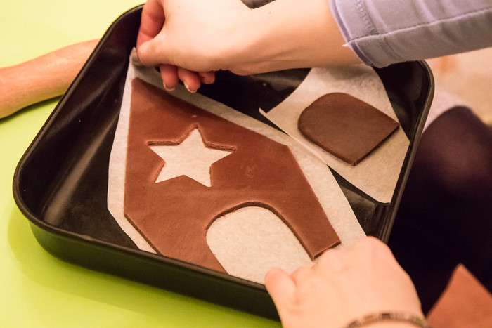 «Бумажное лекало кладём на тесто и по нему ножом вырезаем необходимую деталь. Эта стена у нас будет с дверью и звездочкой сверху. Поэтому делаем дверной проём и вырезаем из теста дверь», – поделилась девушка.