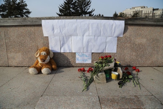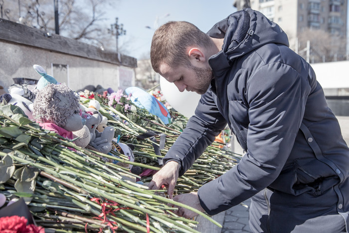 Мимо проходила парочка, парень с девушкой, они посмотрели на меня, как на идиота. Часа полтора я там пробыл и ушел. Сел в одном из заведений города и стал смотреть видео и фотографии с места трагедии. Сами собой потекли слезы. Я просто не мог успокоиться! Решил снова поехать на площадь. Это все было в одну ночь. Купил опять цветы, в этот раз нашел гвоздики, и просидел там еще несколько часов. Когда уже замерз, поехал домой одеться потеплее. Дома взял большую мягкую игрушку, вернулся опять на площадь, положил игрушку. Потом решил, что надо обозначить это место и написал на листах слово «Скорбим». Часов в 7 утра я только уехал домой.