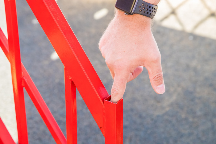 «Вот, смотрите, отверстие. Детский палец может залезть сюда? Может, – демонстрирует Сергей. – Это отверстие не закрыто заглушкой. А должно. Этот недостаток я заметил еще когда площадку открывали. Думал, со временем доведут до ума. Но нет, ничего не исправлено».
