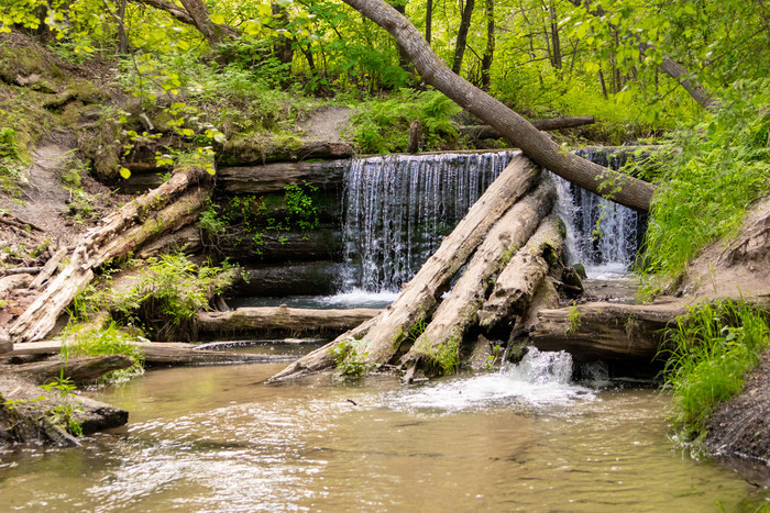 На самом деле этот водопад никакой не природный, а самый что ни на есть рукотворный. Еще видны старые бревна, уложенные друг на друга. Когда-то, в далеком 1905 году, на этом месте стояла водяная мельница. Чтобы обеспечить бесперебойное вращение колеса, была сооружена плотина. Бревна – это то, что от нее осталось.