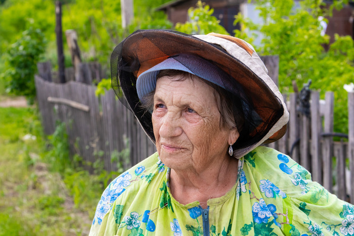 Едем к бабе Маше. Полуразвалившийся дом и объявление на заборе «Продам усадьбу. Недорого». Во дворе стоят несколько пчелиных уликов. Баба Маша как раз занималась пасекой. Ошалевшие от дымокура пчелы поговорить толком не дали.