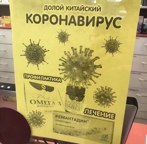 Ну, ладно, отсутствие масок, спишем на сезон ОРВИ (правда, непонятно, почему аптеки не были готовы к сезону, забыли что ли?), но как насчет волшебной панацеи? Некоторые противовирусные и иммунные препараты, продвигаемые Минздравом России, на самом деле и с обычным вирусом безо всяких корон не справляющиеся, внезапно обзавелись специальными рекламными фразами на упаковках, а также рекламой на кассе. С таким же успехом можно было бы впаривать народу аскорбинку, всё полезнее и дешевле.