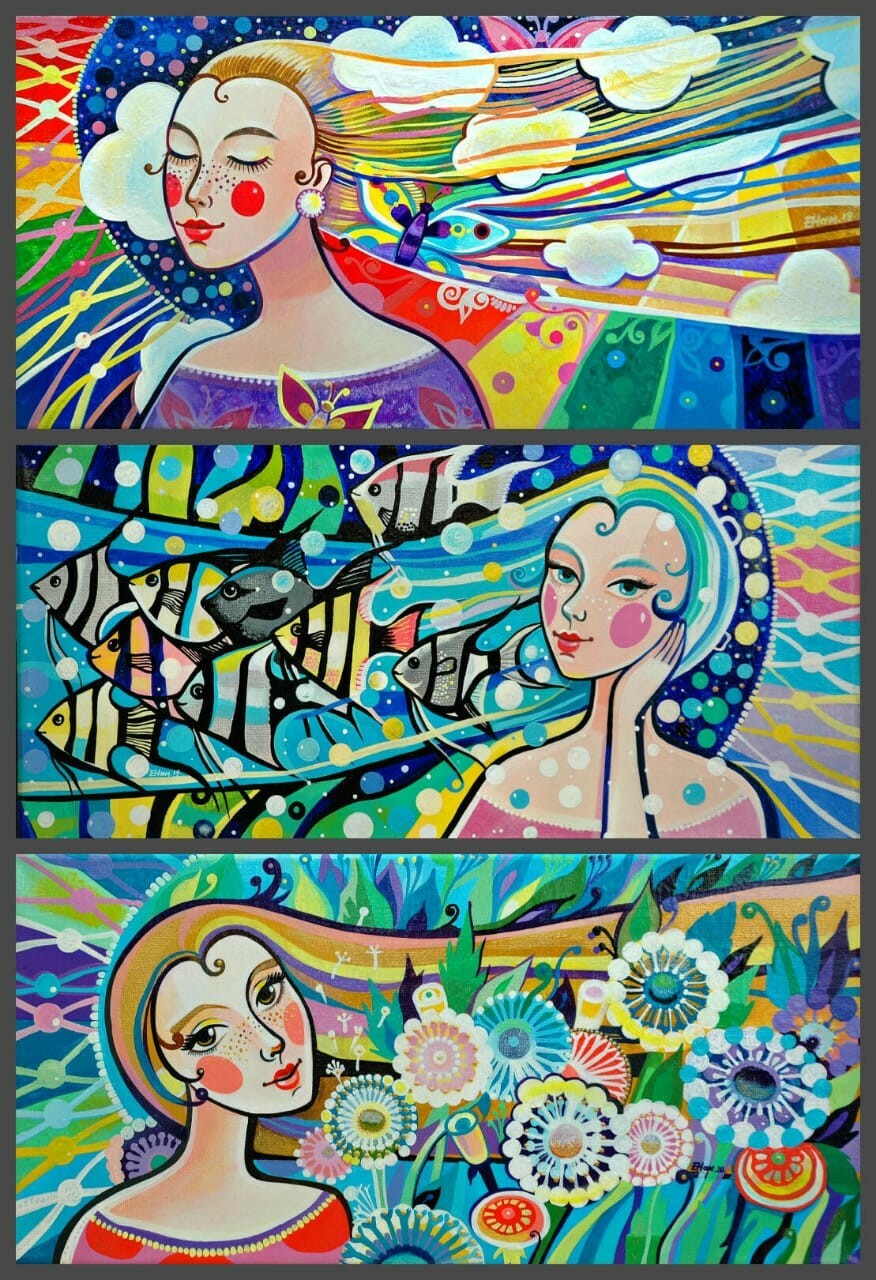 «У меня три картины, связанные между собой. Но изначально была нарисована одна– “Сон”. Идея пришла неожиданно, и я быстро нарисовала эскиз на бумаге, потом доработала. А в этом году так же неожиданно пришло новое видение. Девушка и рыбки-скалярии. И я тоже быстро нарисовала набросок. Но потом я посмотрела на картину «Сон» и на набросок с рыбками и поняла, что у меня рождаются картины стихии. Так появились картины стихии “Воздух”, ”Вода” и ”Земля”. Думаю, скоро появятся ещё одна стихия – “Огонь”».
