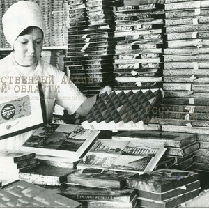 Фотографии предоставлены из фонда фотокорреспондента Виталия Толстенко, они сделаны в 1964 году. На снимках - обычный день на производстве - укладка конфет в коробки, отправка коробок с конфетами в торговую сеть.