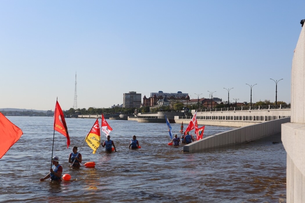 Восемнадцать спортсменов, из которых самому юному исполнилось 13 лет, вышли на берег на набережной реки Амура в районе амфитеатра.