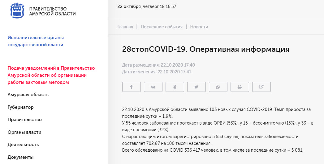 Аналогично, сайт правительства Амурской области, где также ежедневно публикуется статистика заболеваемости коронавирусом в регионе, приводит информацию ограниченно. В целом данные областных властей идентичны данным управления Роспотребнадзора, но есть различия в ряде цифр.