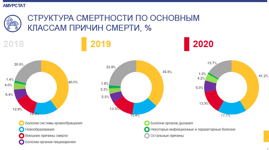Амурстат сейчас публикует только общие данные. Так, большая часть смертей в Амурской области в 2020 году вызвали болезни системы кровообращения. Они стали причиной ухода из жизни в 41,2 % случаев. На втором месте печальной статистики – новообразования, их доля – 17,1 %.