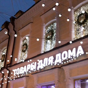 «Товары для дома» украсила красивая подсветка. Знаменитое дерево рядом с магазином утеплили шарфиком, оно также расцвело новогодними огнями.
