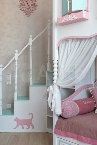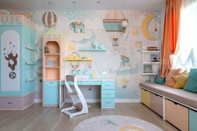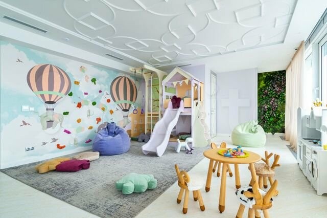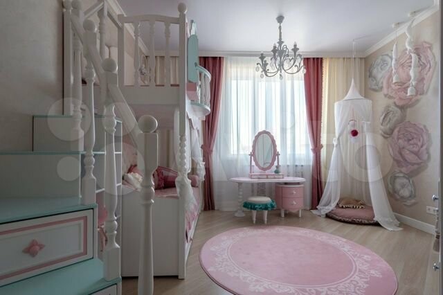 В квартире есть кухня со встроенной техникой, барная и обеденная зоны, 3 санузла и 3 спальни, шкафы, гардеробные, прачечные, ванная комната с джакузи и невероятная детская с мини-сценой!
