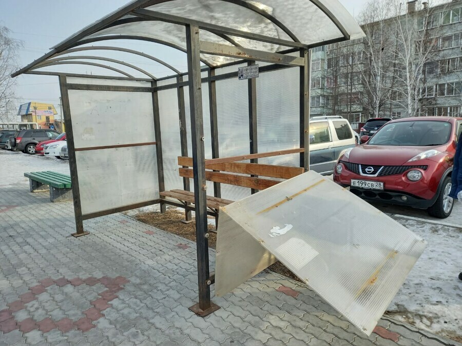 В областном центре Приамурья от сильного ветра с порывами до 20 метров в секунду пострадали остановки. Ураган буквально снял боковые и задние пластиковые панели.