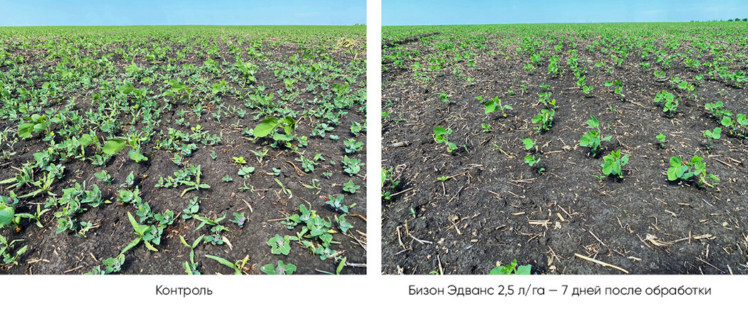 Оптимальная норма расхода Бизона Эдванс – 2,5 л/га. При такой норме и обработке в оптимальную фазу развития сорняков достигается 95 % эффективность против двудольных сорняков первой волны. При появлении второй волны возможно повторное применение Бизона Эдванс в дозе 2,5 л/га до фазы ветвления сои.
