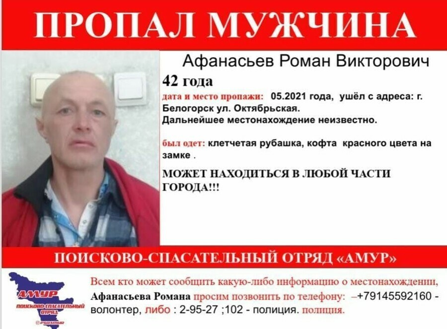 Всех, кому что-либо известно о местонахождении амурчан, просят позвонить по телефонам: +7-914-559-21-60 – волонтер, либо: 2-95-27 или 102 – полиция.