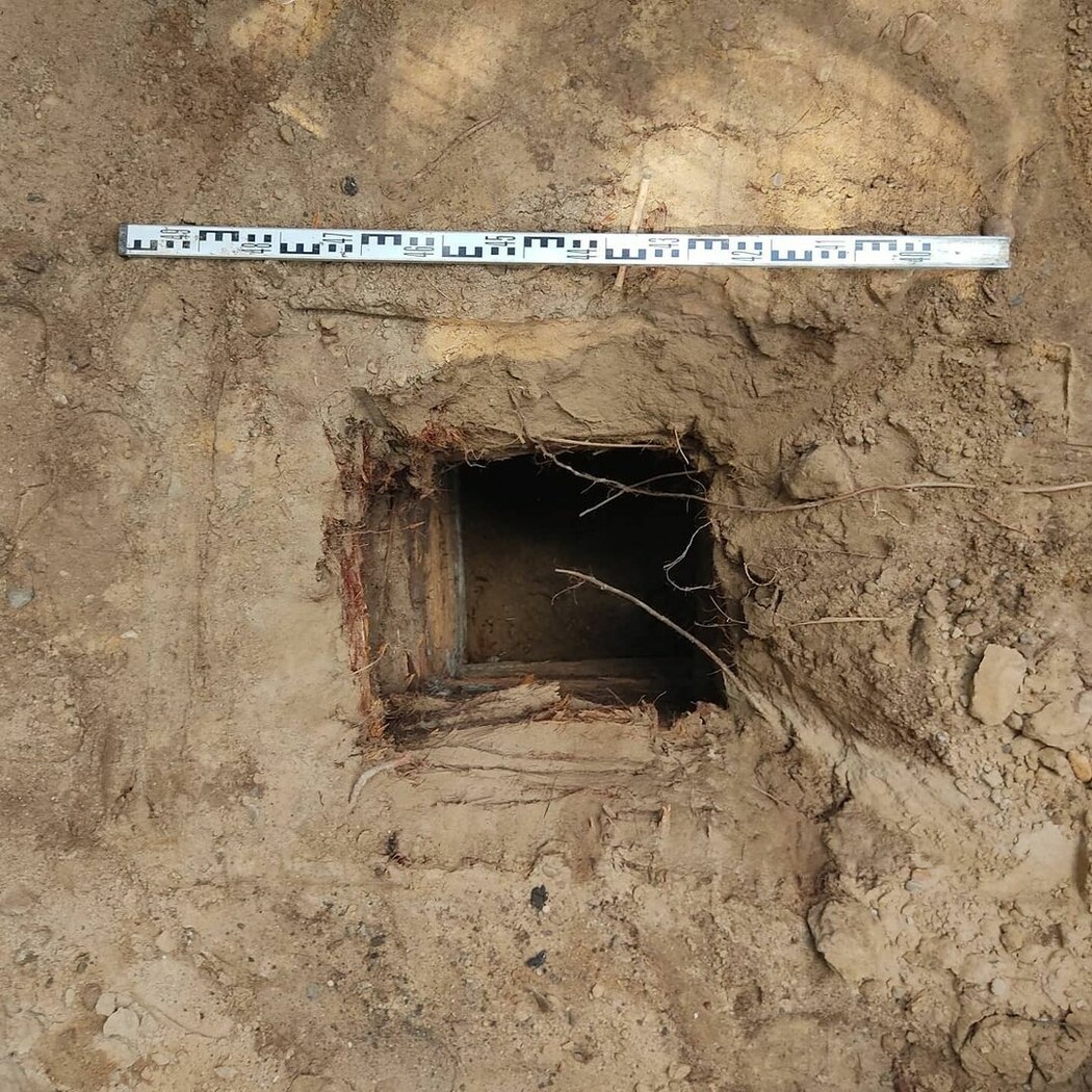 «Провал представляет собой яму в желтом материковом песке без следов разрушения вышележащих горизонтов (скорее всего, верхние слои со следами переотложенного грунта как раз и провалились в провал и не фиксируются в стенках), на дне которого фиксируется квадратное отверстие, обложенное деревянными досками толщиной до 10 сантиметров и шириной до 40. Данное отверстие представляет собой вертикальный лаз в глубину и имеет размеры 70 на 70 сантиметров. Глубина залегания фиксируемой части лаза составляет 155 сантиметров», – пишет ЦСНАМУР в своем Instagram.