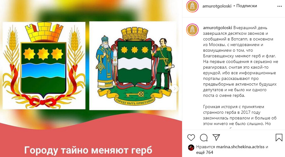 Пост с негодованием по поводу изменения герба опубликовал популярный краеведческий паблик @amurotgoloski. Краеведы сообщили, что неожиданно для себя узнали об изменениях, которые вносят в герб амурской столицы, и возмутились тем, что об этом не знала широкая общественность.