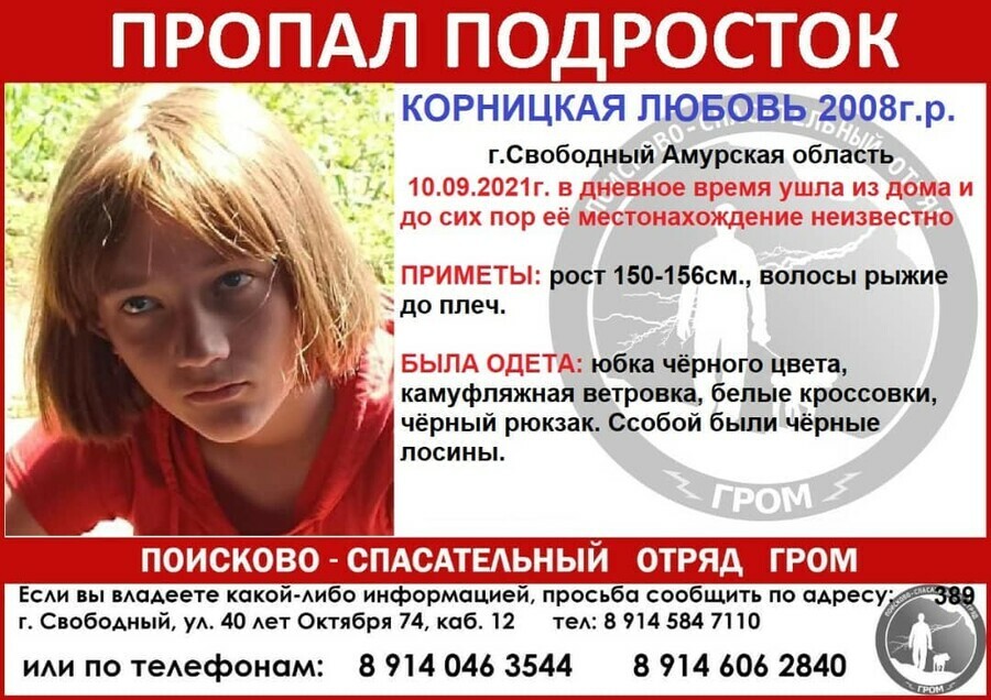 В Свободном ушла из дома и не вернулась 13-летяя Любовь Корницкая. С 10 сентября девочку не могут найти.