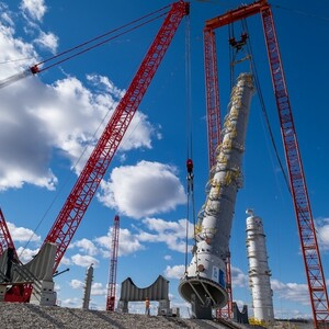 Подъём «гиганта» весом более 1000 тонн длился 8 часов. Колонну вертикализировали с помощью специальной портальной системы и вспомогательного крана.