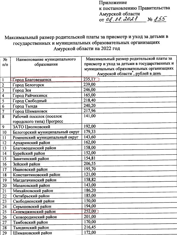 Как сообщал Amur.life, проект постановления повышения платы подготовили в региональном министерстве образования. Проектом предлагалось установить максимальные размеры оплаты и для остальных территорий Амурской области. Для Белогорска – 239 рублей за один день, Зеи – 246 рублей, Райчихинска – 165 рублей, Свободного – 218,4 рубля, Тынды – 240,2 рубля, Шимановска – 217,96 рубля, Прогресса – 141 рубль, Циолковского – 192 рубля.