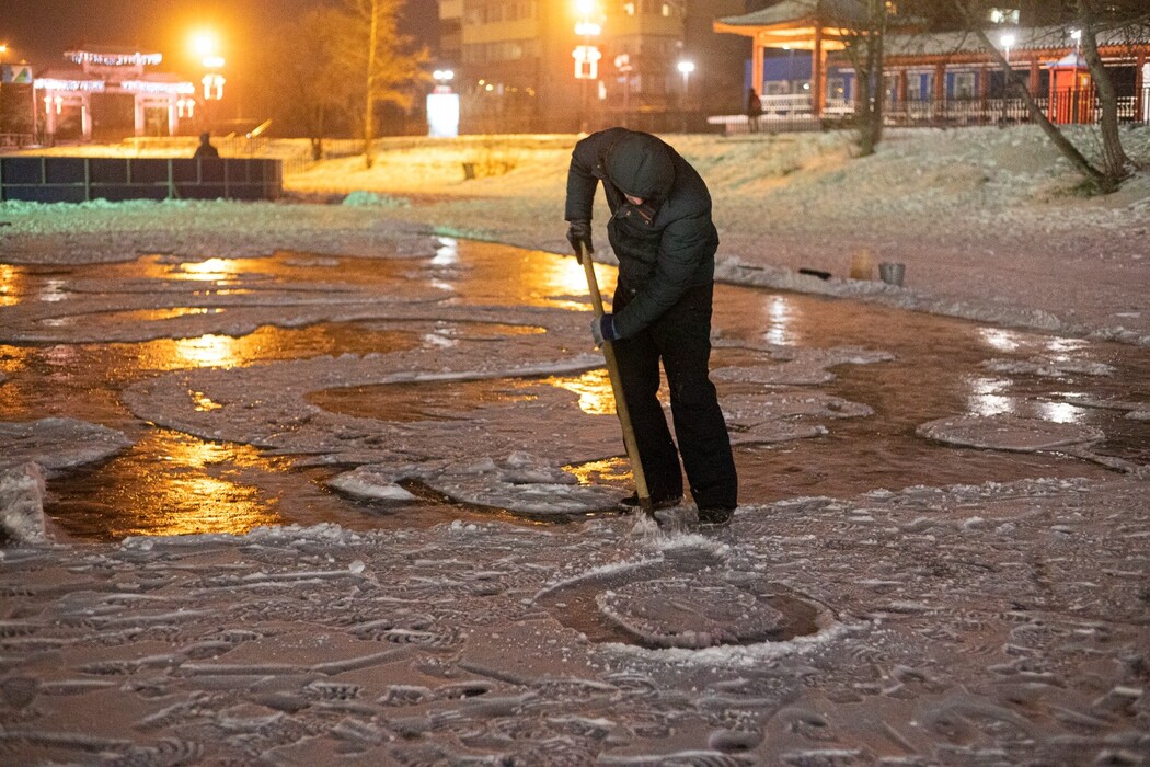 В парке Дружбы Благовещенска вечером 3 декабря появилась ледовая открытка с изображением дракона. Ее в течение 7 часов изготавливали сотрудники ОКЦ Станислав Гаврик и Виталий Гуз.