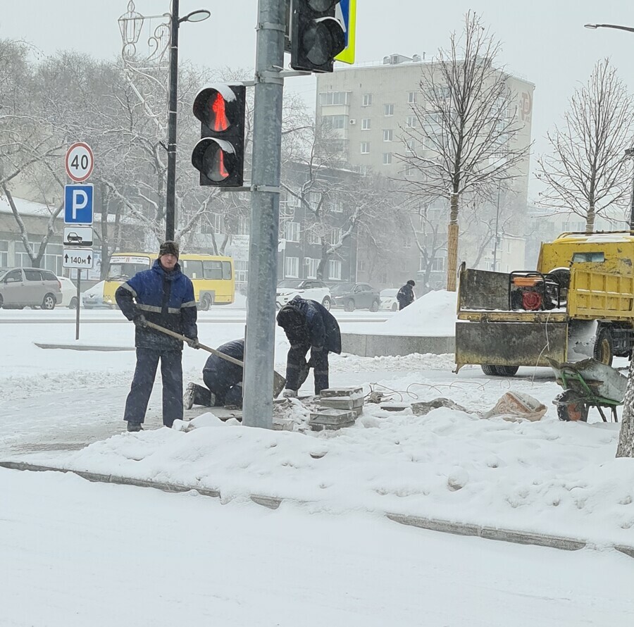 В областном центре Приамурья рабочие меняли плитку на углу улиц Ленина и Пионерской. Работы велись утром, 20 декабря, вскоре после ночного снегопада, что очень озадачило некоторых горожан.