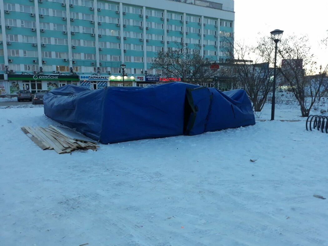 Рядом с гостиницей "Юбилейная" под пологом лежит еще одна конструкция. Что это будет, пока неизвестно.