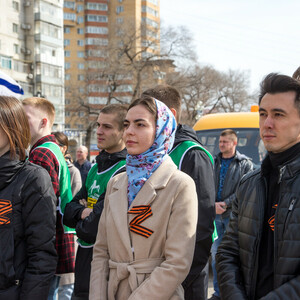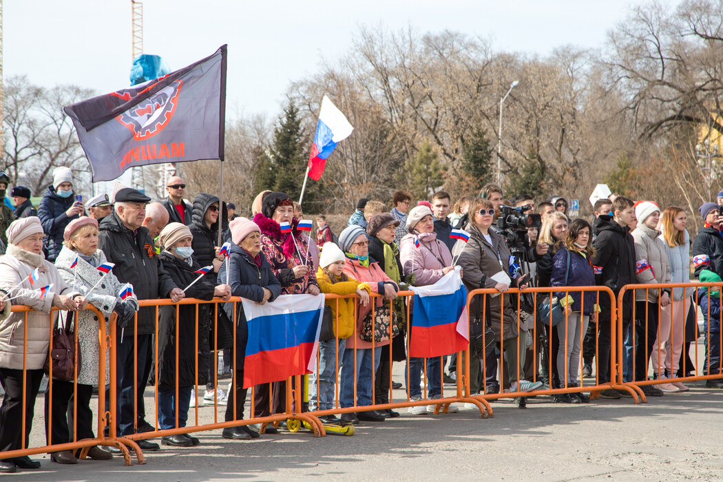 Вместе собравшиеся исполнили национальный гимн, песни «Россия», «Донбасс за нами!». Волонтеры с триколорами выстроились в знак «V».
