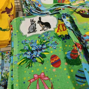 Продаются фигурки цыплят, кроликов и полотенца с символикой Пасхи.