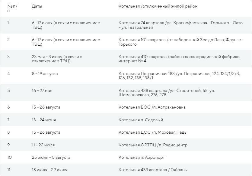 Кроме того, подготовку объектов теплоснабжения к будущему осенне-зимнему периоду проводят и «Амурские коммунальные системы». В связи с этим в различных районах города, также по графику на время проведения работ, будет отсутствовать горячее водоснабжение.