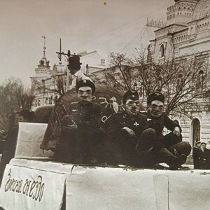 Приметы того времени – стройные ряды пионеров, юный барабанщик и фрагмент транспаранта, где угадывается надпись: «Фестиваль. Москва. 1957» – шестой Всемирный фестиваль молодёжи и студентов откроется в Москве 28 июля.