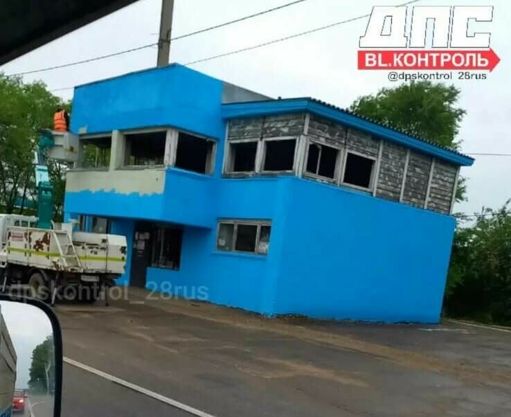 На трассе Благовещенск – Гомелевка покрасили здание бывшего поста ГАИ. Двухэтажное строение, расположенное на 11 километре дороги за мостом через Зею, теперь ярко-синего цвета.