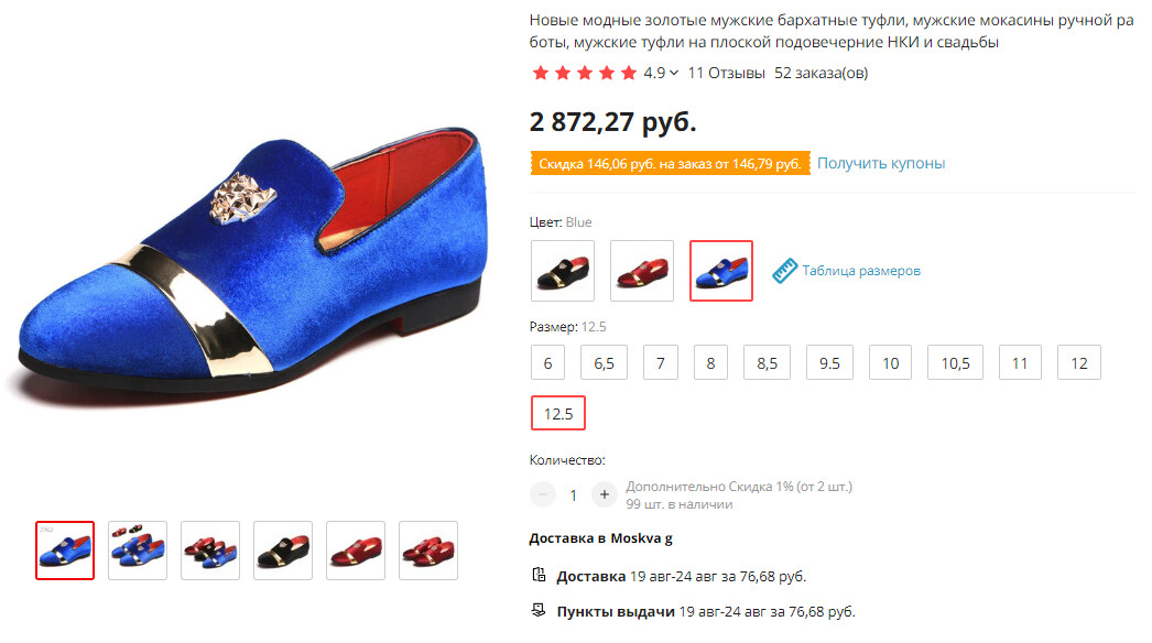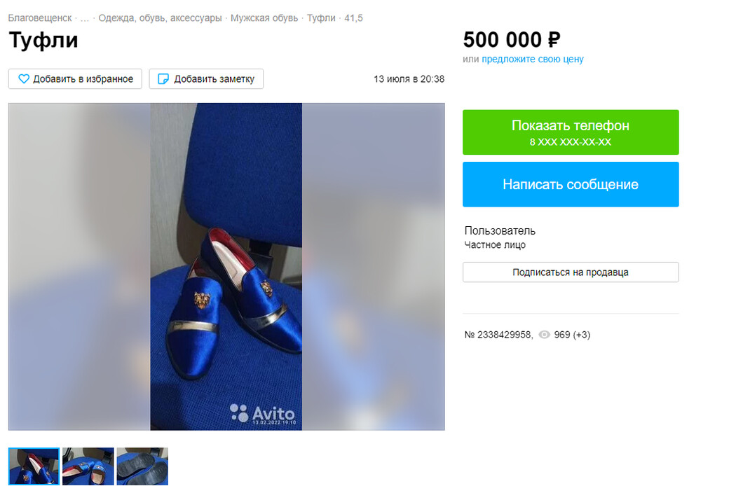 Так, автор объявления предлагает приобрести синие мокасины всего за 500 тысяч рублей.