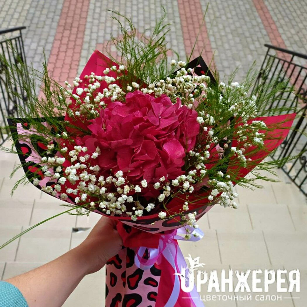 Очень часто берут букеты с одним крупным красивым цветком, – например, гортензией или одноголовой хризантемой, и вокруг делается красивое оформление.