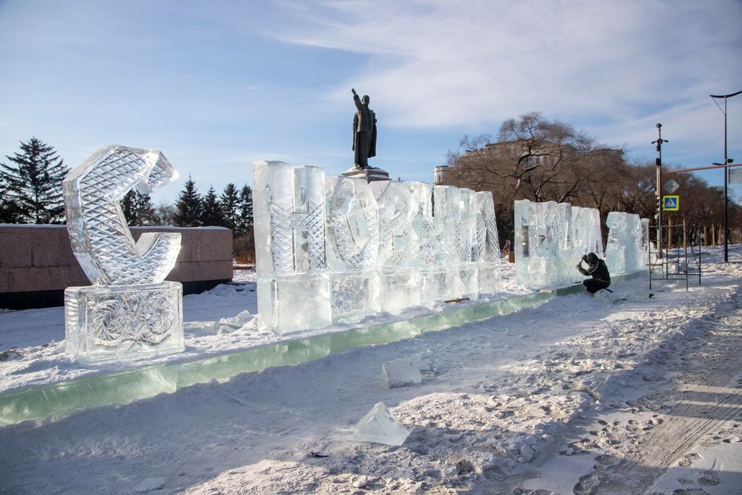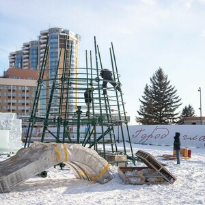 На главной городской площади монтируют каркас ели, собирают арки и ваяют ледяные скульптуры. На следующей неделе все работы планируют завершить.