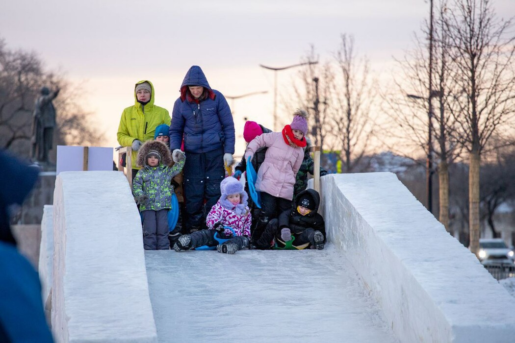 Жители и гости областного центра катаются на горках и отдыхают на свежем морозном воздухе. Амурчане с детьми катаются с горок и гуляют среди ледяных фигур.