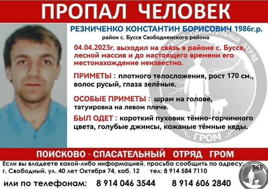Поисково-спасательный отряд «Гром» распространил ориентировку на пропавшего Константина Резниченко. По имеющейся информации, 37-летний мужчина 4 апреля перестал выходить на связь с родными, находясь в лесополосе Свободненского района неподалеку от села Буссе.