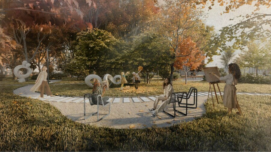 В сквере разместится зона отдыха со столиками, похожая на коворкинг, куда можно прийти поработать со своим ноутбуком, и небольшой кинотеатр под открытым небом. На территории обновят плитку, вдоль дороги обустроят газоны, высадят живую изгородь и заменят автобусный павильон.