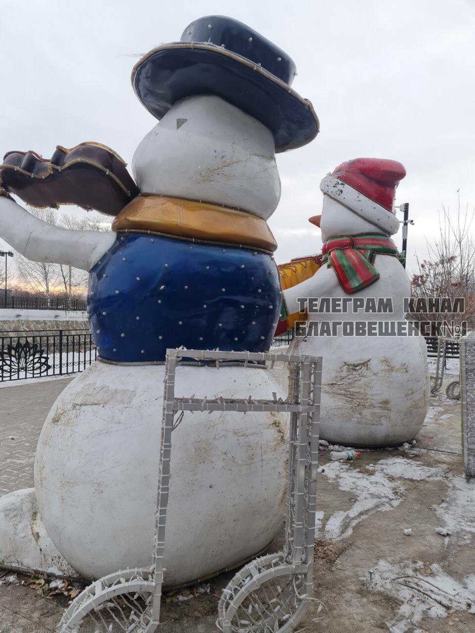 Фотографии грязных снеговиков опубликовал телеграм-канал «Благовещенск № 1», который отметил, что установленный новогодний инвентарь «забыли привести в порядок».