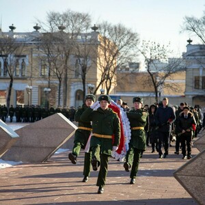 Первые лица города и области, в том числе мэр Благовещенска Олег Имамеев, ветераны, военнослужащие и курсанты ДВОКУ, работники учреждений и организаций, школьники и студенты возложили цветы к Вечному огню на площади Победы.
