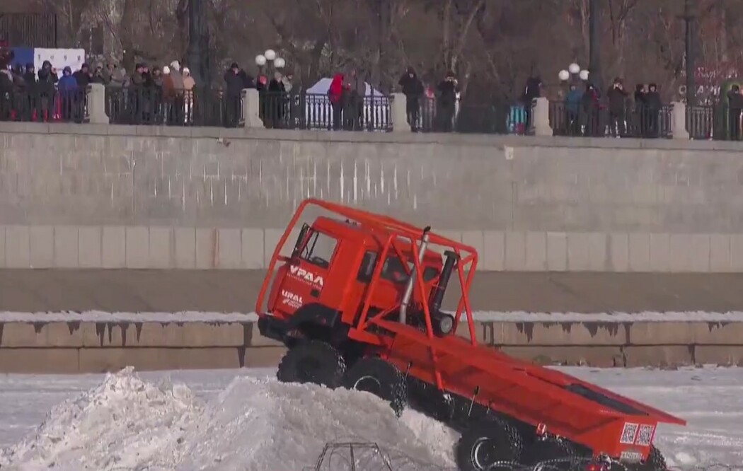 В Благовещенске второй день международных российско-китайских зимних игр открыли показательные выступления команды «КамАЗ-мастер». На трассу вышли пилот Дмитрий Сотников и китайский гонщик. Они показали сумасшедший дрифт на льду реки Амур на тяжелых грузовиках, вес которых достигает 11 тонн.