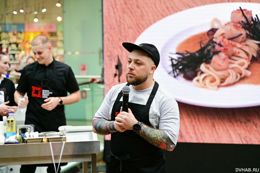 Кулинарный поединок проходил в окружении хабаровчан, собравшихся посмотреть, как профессионалы красиво готовят еду, и выигрывать призы, которые организовали не только для участников, но и для зрителей.