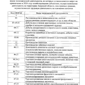 В их числе растениеводство и животноводство, охота; добыча драгметаллов и других полезных ископаемых; разработка карьеров; производство детского питания и напитков; оптовая и розничная торговля, в том числе розничная торговля фруктами и овощами, мясом и мясными продуктами, рыбой и морепродуктами, алкогольной продукцией. Также запрещается привлекать иностранцев по патенту в качестве водителей автобусов и такси. При этом в сфере перевозки пассажиров на автобусах городского и пригородного сообщения по заказам исключение составляют перевозки арендованными автобусами с водителем по туристическим или экскурсионным маршрутам.