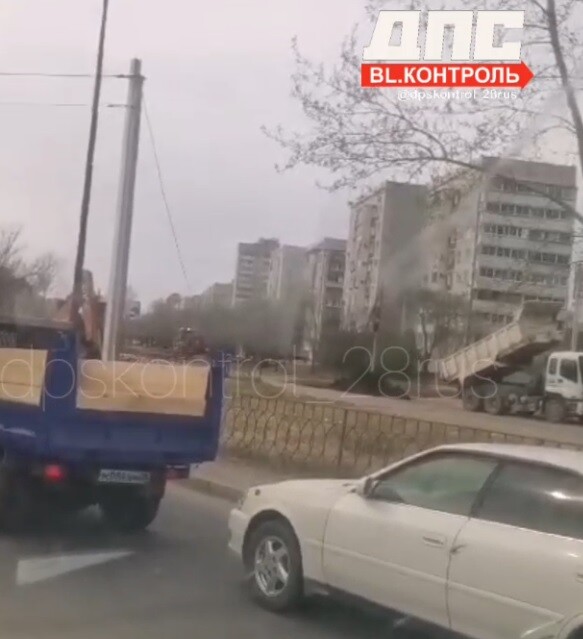 «Вон провод висит, автобусы не могут проехать в сторону кольца. Самосвал снес провод, мужики пытаются проехать», – рассказал очевидец в ролике Telegram-канала dpskontrol_28rus.