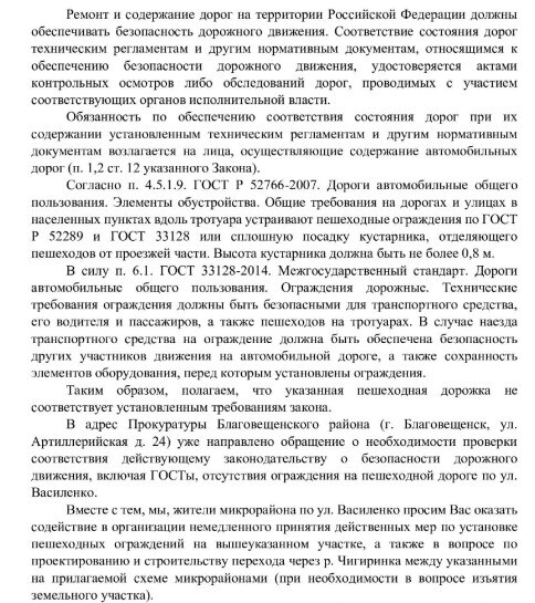 В обращении указано, что в адрес прокуратуры Благовещенского района ранее было направлено обращение о необходимости проверки соответствия действующему законодательству о безопасности дорожного движения, включая ГОСТы, отсутствие ограждения на пешеходной дороге по улице Василенко.