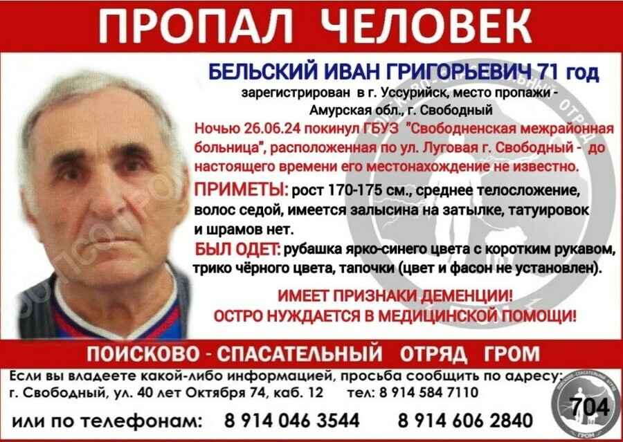 «Уважаемые жители Свободного и Свободненского района! Обратите внимание на ориентировку, распространите её среди как можно большего количества пользователей социальных сетей. ИВАН ГРИГОРЬЕВИЧ ОСТРО НУЖДАЕТСЯ В МЕДИЦИНСКОЙ ПОМОЩИ! Если вы располагаете какой-либо информацией о местонахождении этого человека, незамедлительно обратитесь к волонтёрам, чьи номера указаны в ориентировке, или в дежурную часть своего населённого пункта», – обратились к амурчанам поисковики.